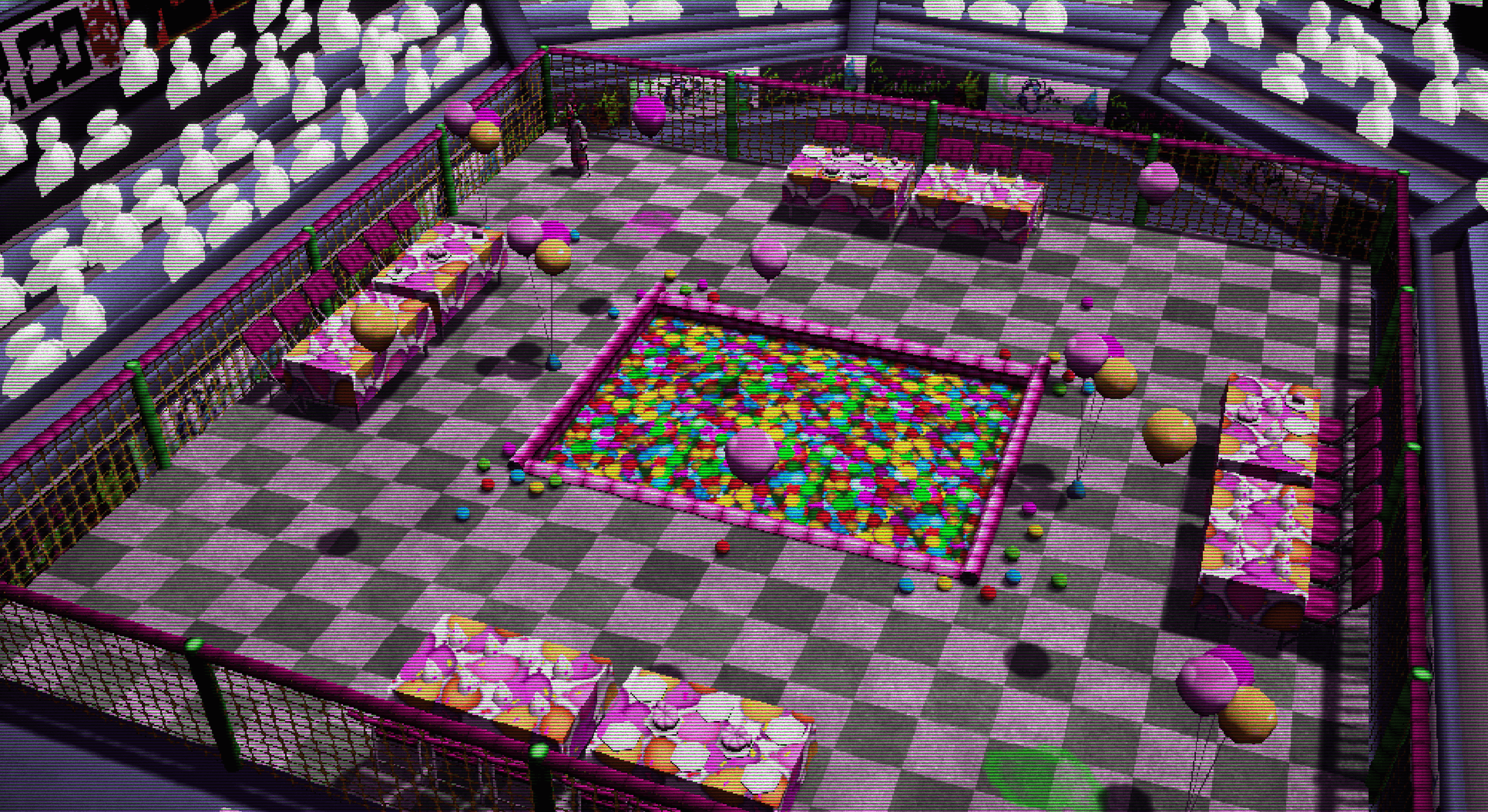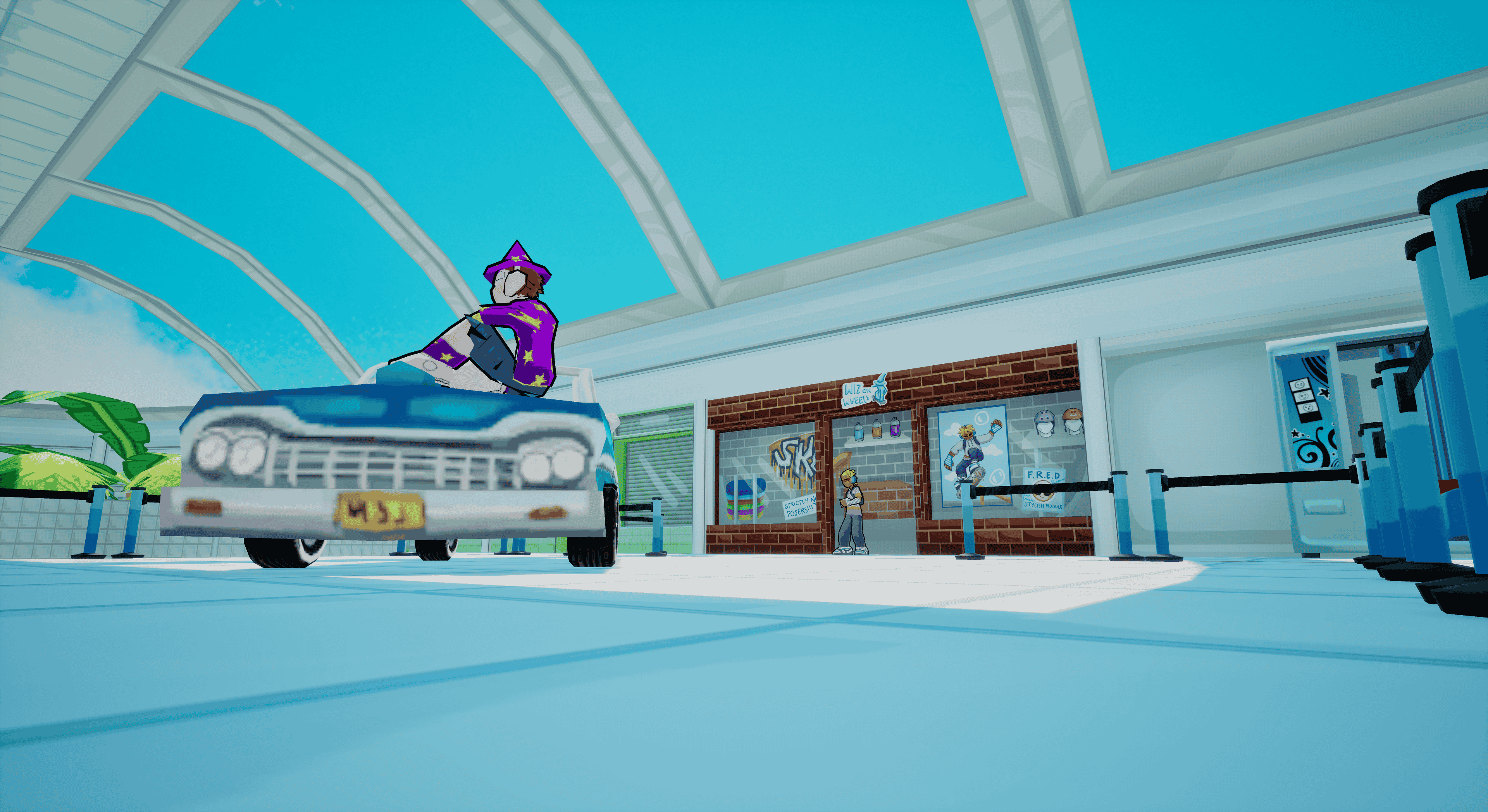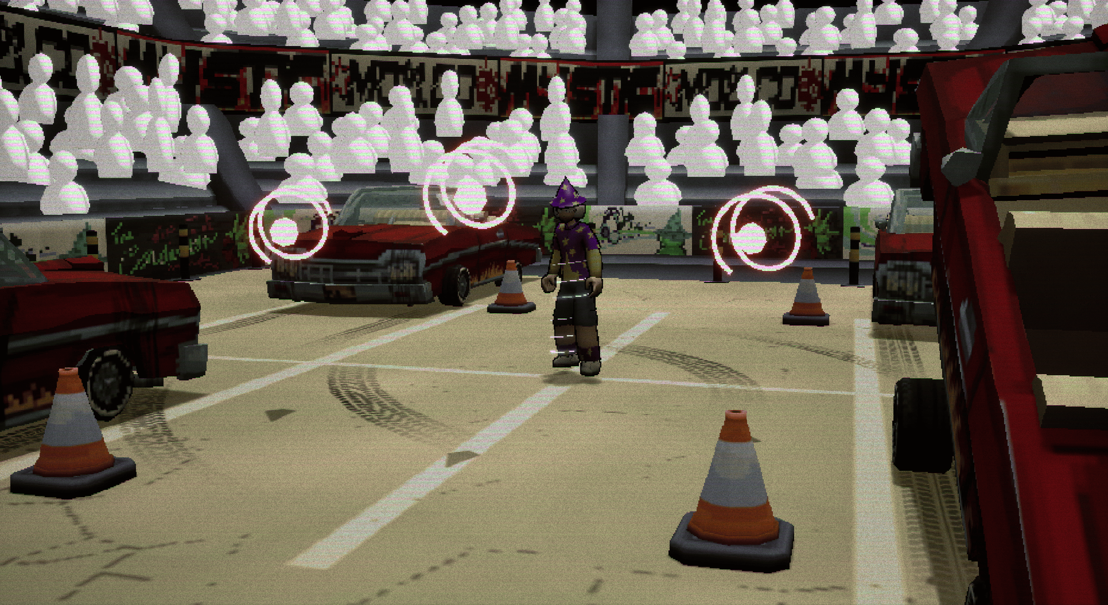 Talk to the shop owners around the mall to engage in battles. Use the disc to scratch out spells in the arena to beat them. Learn new spells and acquire powerful new modifiers to grow stronger until you fight the Conductor.